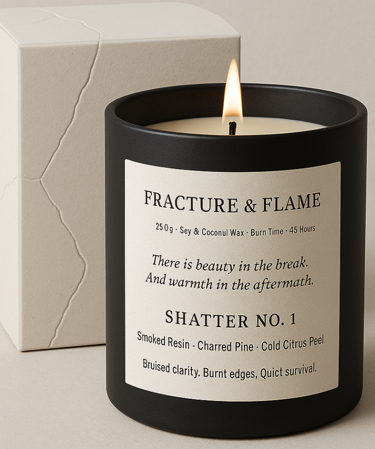 Fracture & Flame is a candle company rooted in emotional honesty, focused on the quiet chaos of the human experience — particularly mental health, burnout, masculinity, and healing. With a commitment to brutal elegance, the brand combines minimalist design with raw storytelling to craft objects of light that reflect what breaks us and what binds us.